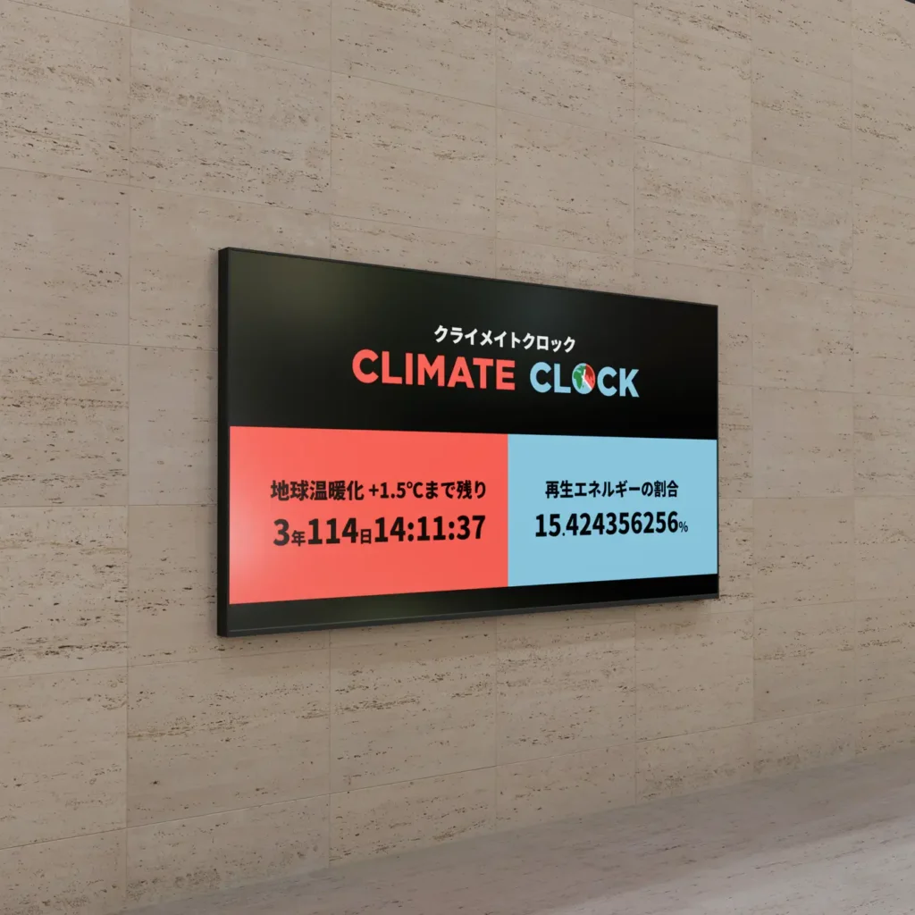 現在、私たちはこの夢の実現に向けた具体的なアクションとして、「クライメイトクロック(気候時計)」のデジタルサイネージ用コンテンツを無償提供しています。